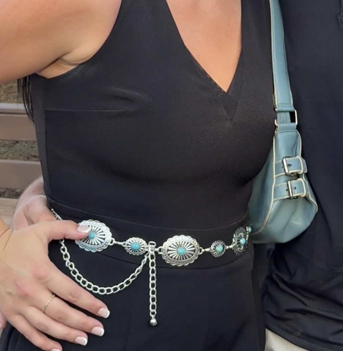 Western-Concho-Belt-Women Cowgirl-Metal-Belts with Boho Silver Vintage Turquoise Chain adds eye-catching Western flair—perfect accent for jeans, dresses, or skirts with adjustable fit.