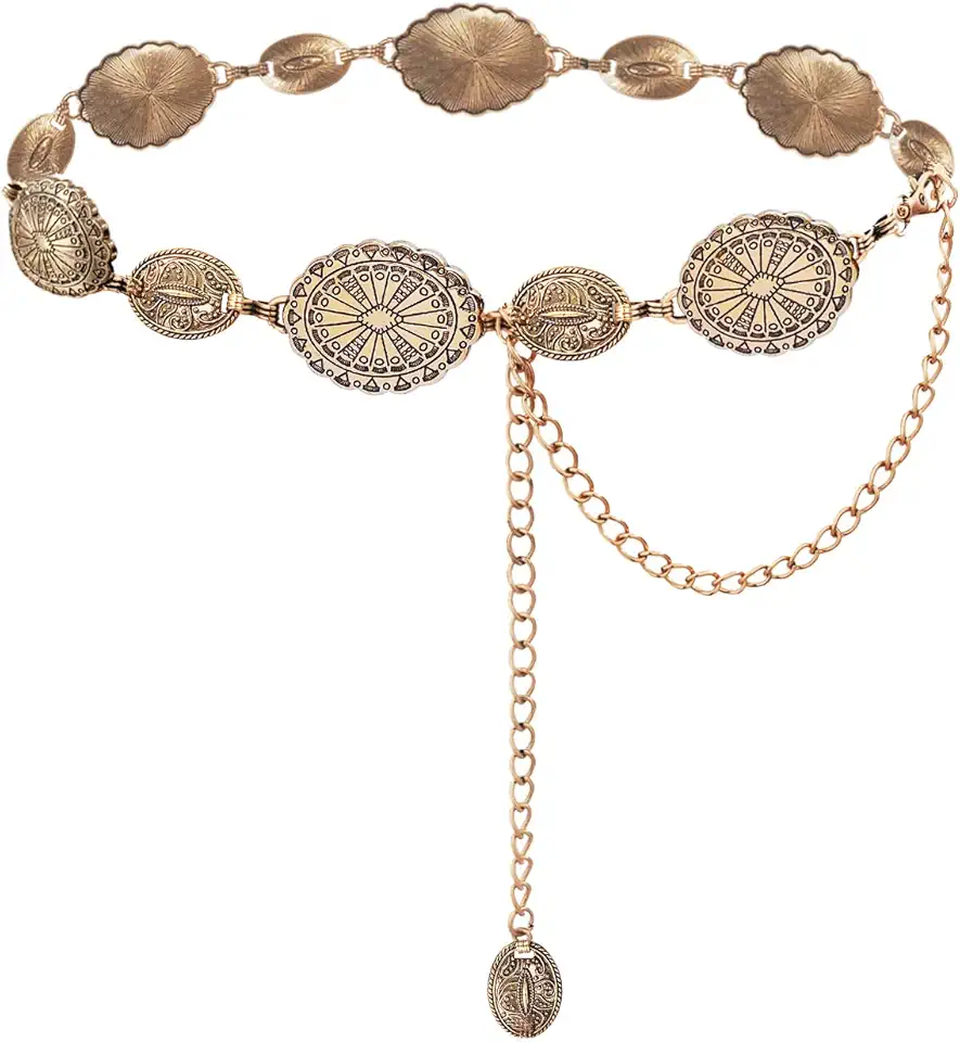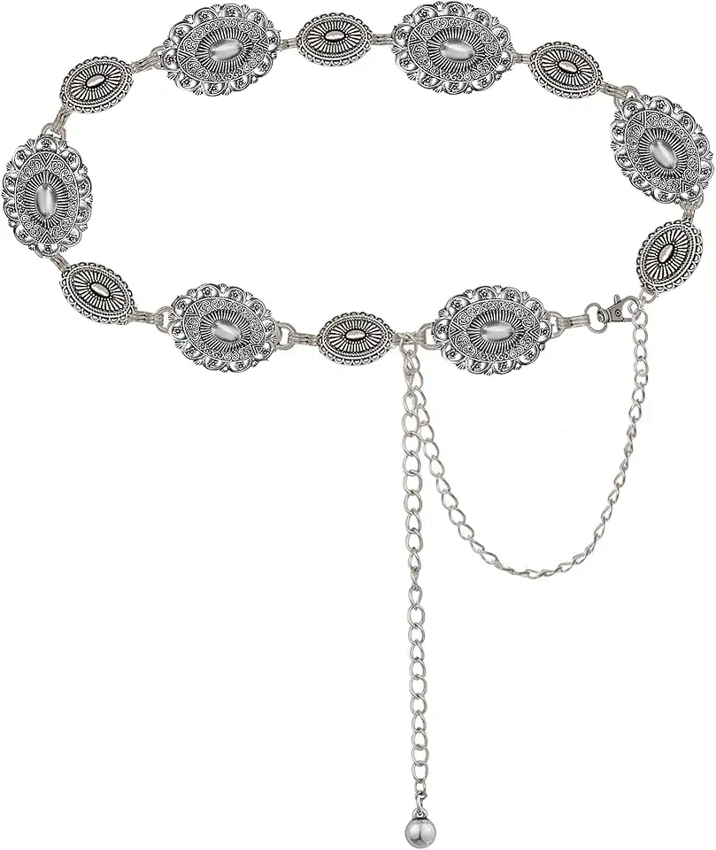 Western Metal Concho Belt for Women Cowgirl Chain Belts elevates concert or casual looks—silver conchos and chain design pair beautifully with boots and denim for authentic cowgirl vibe.